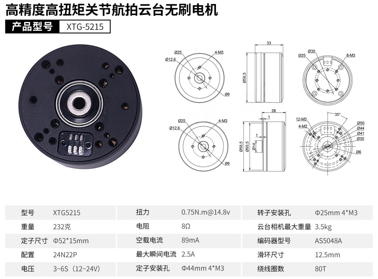 產品名稱:XTG-5215 高精度高扭矩關節航拍云臺無刷電機