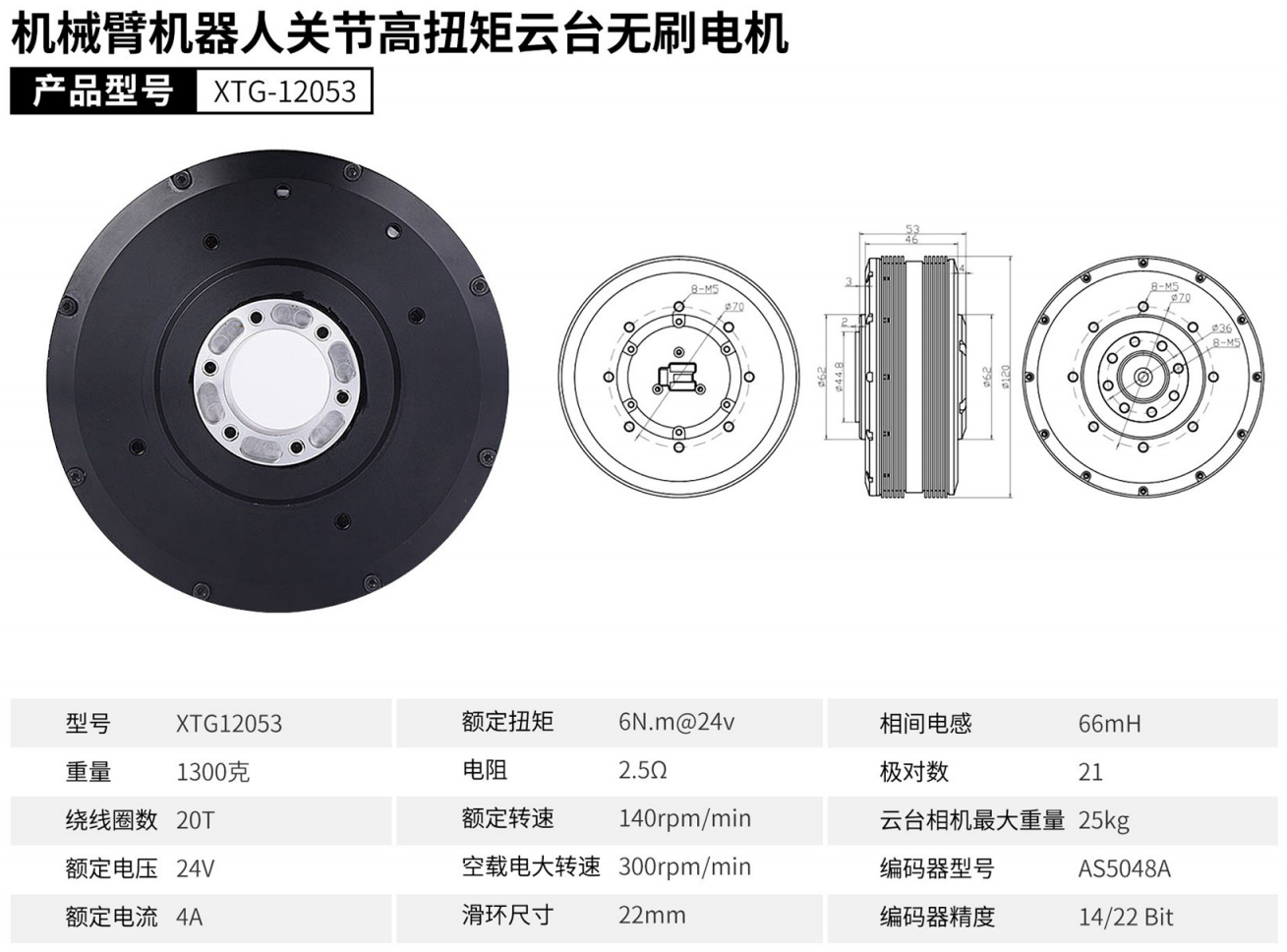 產(chǎn)品名稱:XTG-12053 機(jī)械臂機(jī)器人關(guān)節(jié)高扭矩云臺(tái)無刷電機(jī)