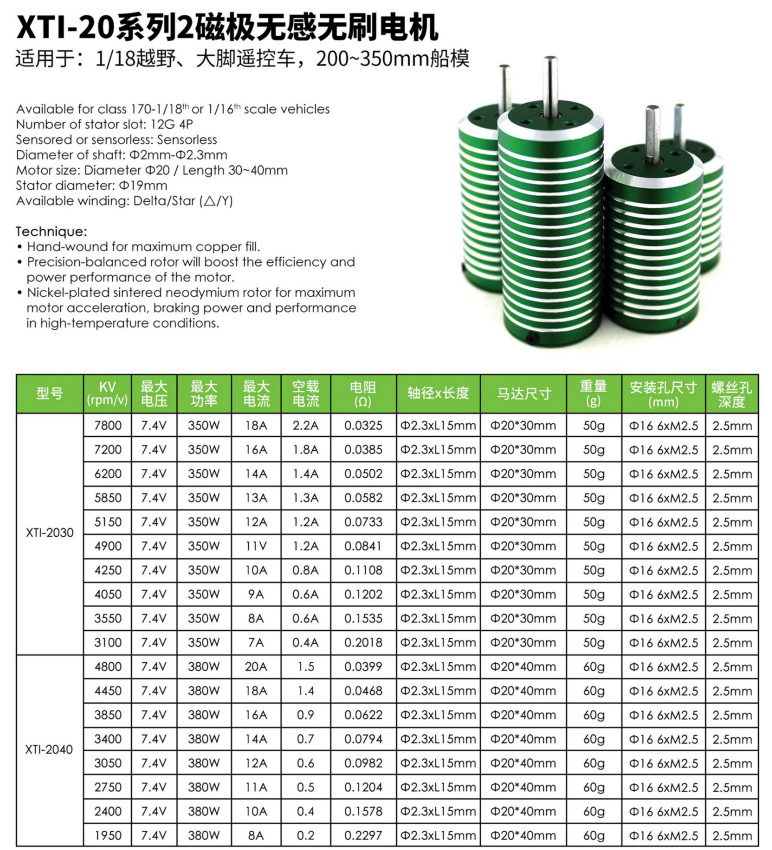 產品名稱:XTI-2030-7800KV 用于1/18越野、大腳遙控車,200~350mm船模 電機